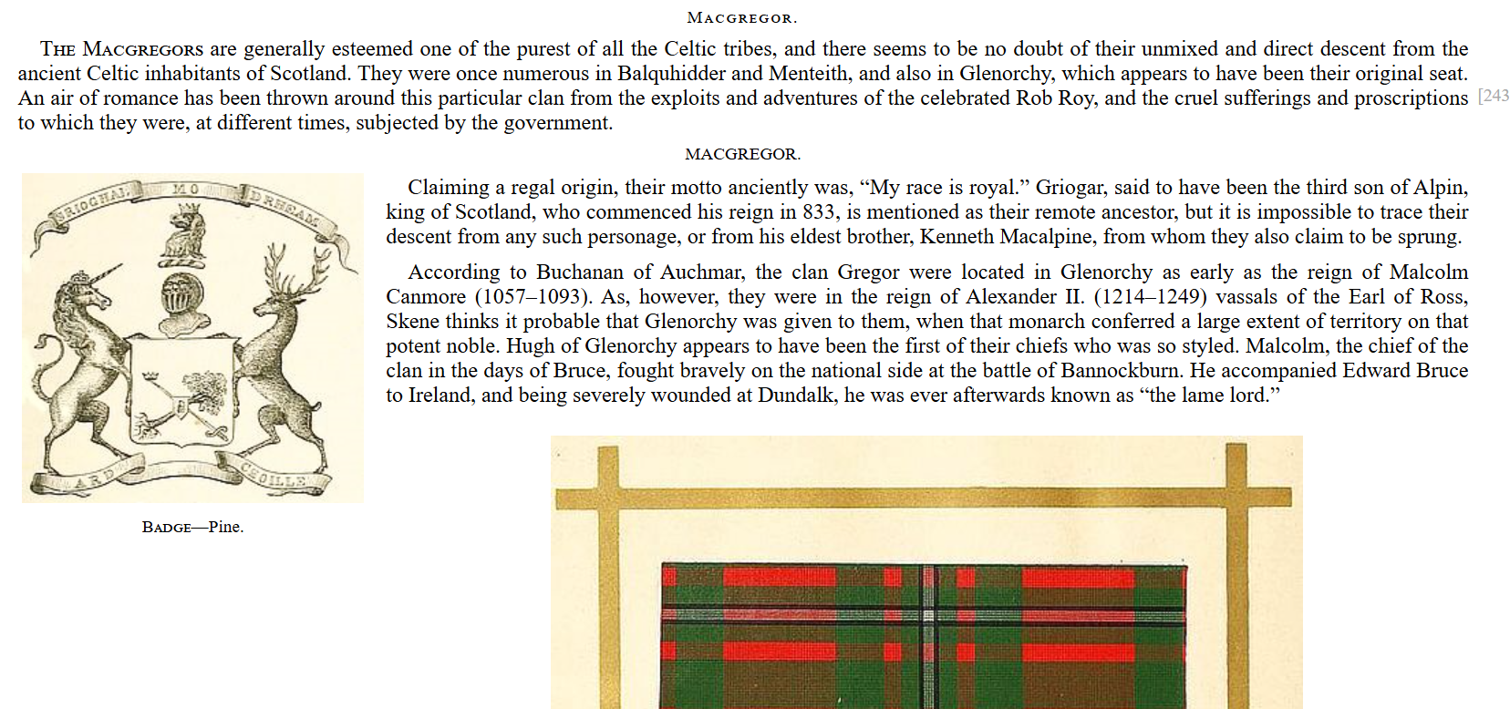 The ancient motto of Clan Gregor, “’S Rioghal Mo Dhream” — “Royal is my race,” has often been explained through the clan’s place among the Siol Alpine, those Highland kindreds traditionally said to descend from Kenneth MacAlpin. Yet older clan histories are careful: they affirm the MacGregors as one of the purest Celtic tribes of Scotland and acknowledge their ancient claim to regal origin, while also admitting that a literal descent from Alpin or Kenneth MacAlpin cannot be securely traced.